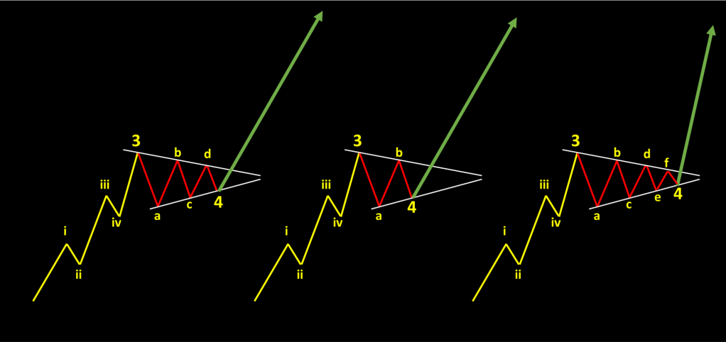 The sub-waves may be composed of complex combinations and not just zigzags or flats. Although it may look easy in theory to spot a triangle, it may take a little practice to become familiar with them in the market.