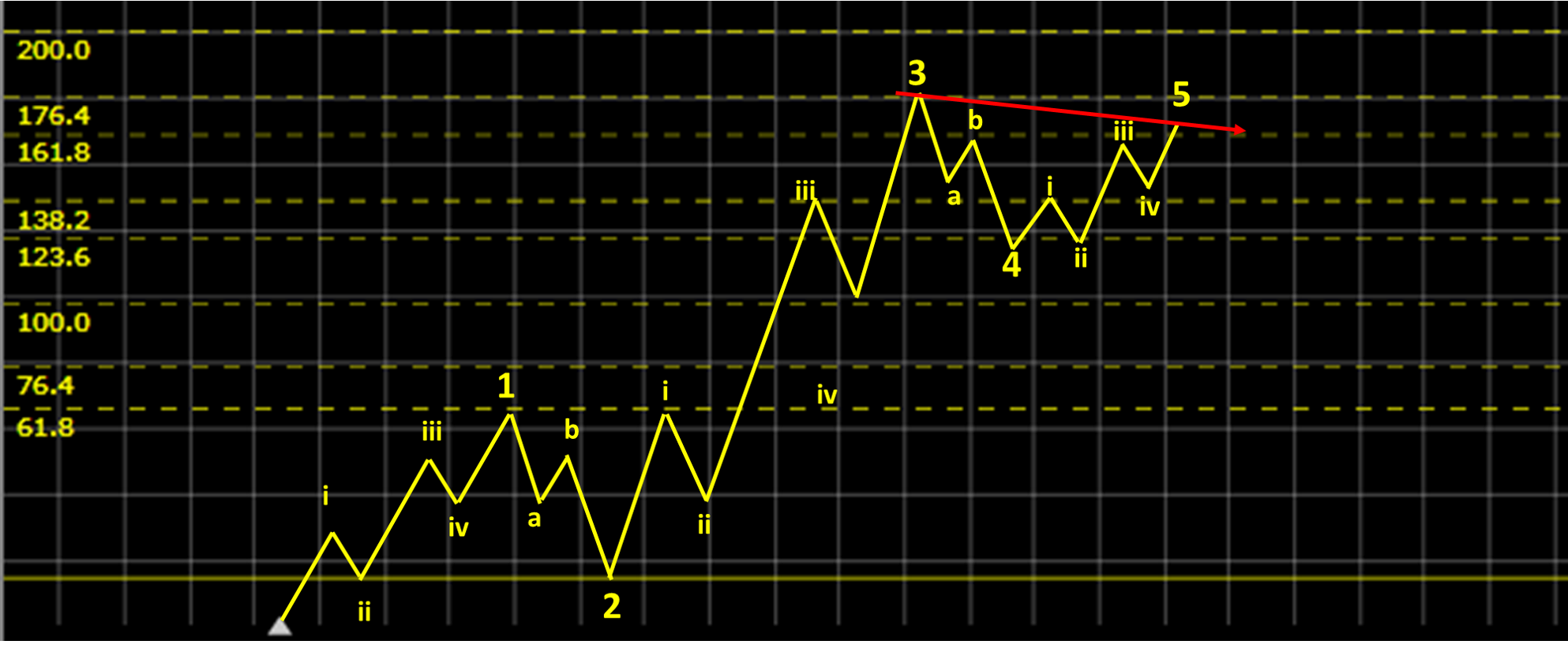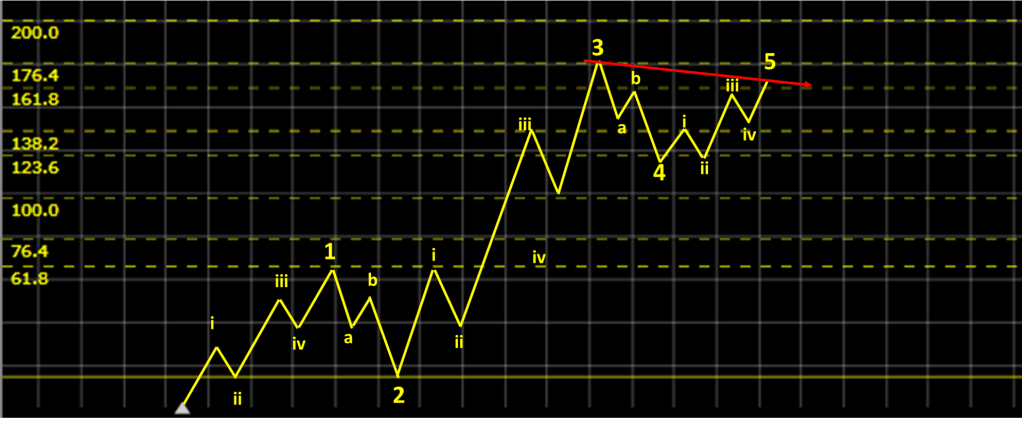A Truncation, or truncated fifth, consists of 5 sub-waves, like all motive waves. It often occurs after a particularly strong third wave. However, there is also a chance that sentiment, for whatever reason, has become so strong in the opposite direction of the trend that a Wave 5 will not terminate beyond the price of Wave 3.