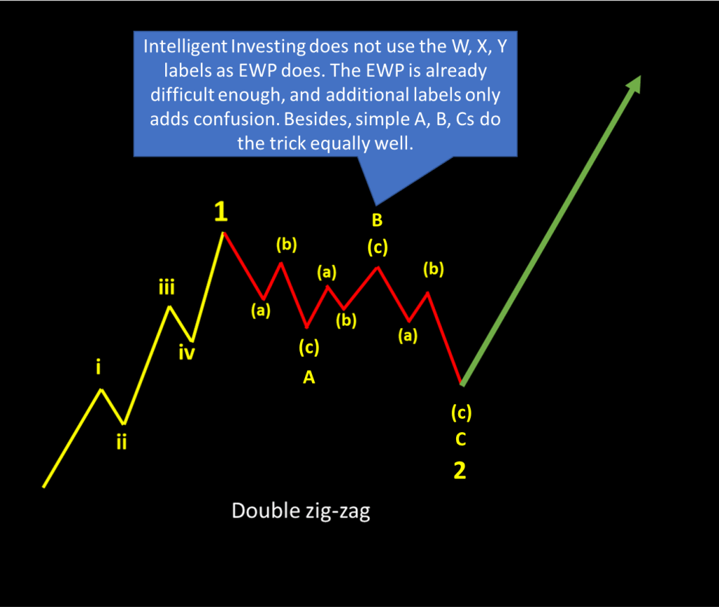 A combination is composed of the corrective waves seen above and seems to be a corrective wave’s way of extending sideways for the most part. Combinations are mostly sideways corrections but can be sharp in the double or triple zigzag case. The structure is officially labeled as W-X-Y for a double combination or W-X-Y-X-Z for a triple combination. However, I find that labeling is too complex, confusing, and not fitting with all the other labels and thus rather simply use smaller degree a, b, c labels since corrections are always a, b, c, (d, e)’s anyway. So why confuse us poor souls with more letters!? The diagram below shows the theoretical breakdown of the wave structure of a double zigzag.