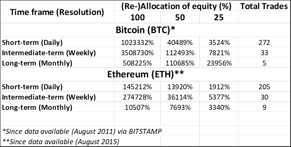 Our systems work best when you use them consistently over time, allowing them to compound profits. For example, our long-term trading system for BTC has executed five trades since 2012, with a sixth underway since February 28, 2023. It is currently up ~200%. Two trades were losses (-16.1% and -31.2%); three were winners (+9,480%, +1,960%, +346%). Thus, our trading systems keep losers small and allow winners to run as any sound system should. All back-tested results for Bitcoin are available here.