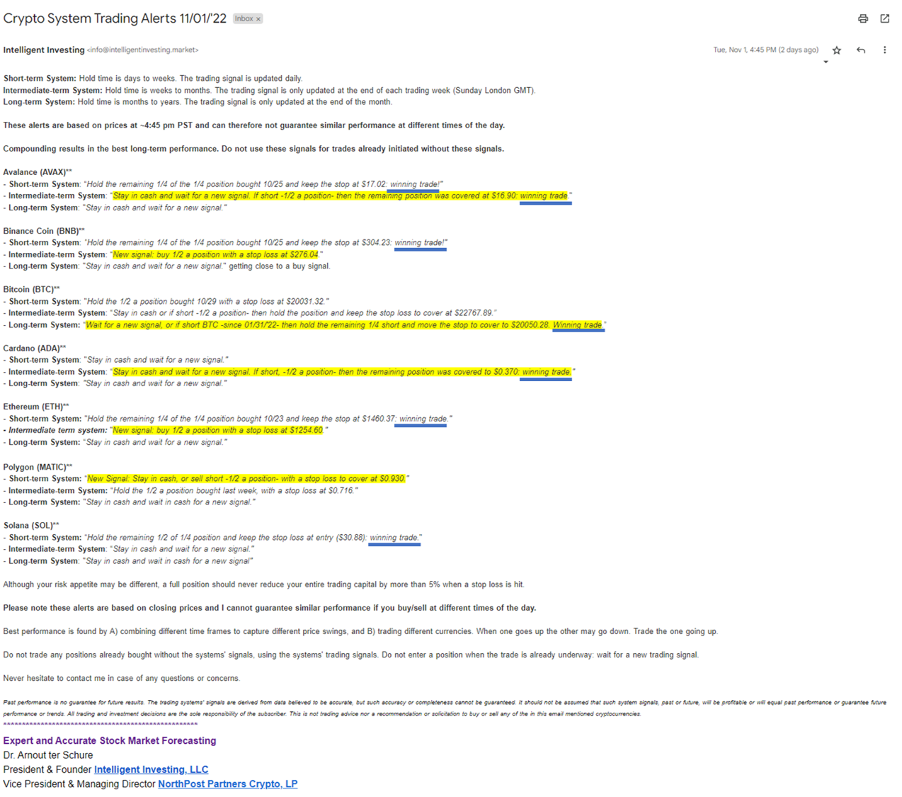 New to crypto trading? Don’t know how to start? Or need an extra system to supplement what you already do. Then our trading algorithm signals are just what you need as they signal daily when and what to buy, sell, and hold, where to place as stop levels, take profits, etc. They are included in our daily Newsletter.* Short-term system signals are updated at the end of each day. Intermediate-term signals at the end of each week. Long-term signals are updated on the last trading day of each month. You pick the Cryptos and time frames you like to trade.